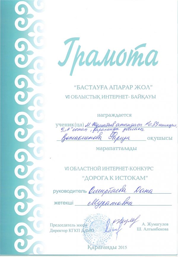 Білім беру саласында Қарағанды облысы әкімінің сыйлығын тағайындау конкурсына қатысқаны үшін Нухридинова Жұмакүл Диханбайқызына сертификат берілді. Зор денсаулық тілеп, еңб…