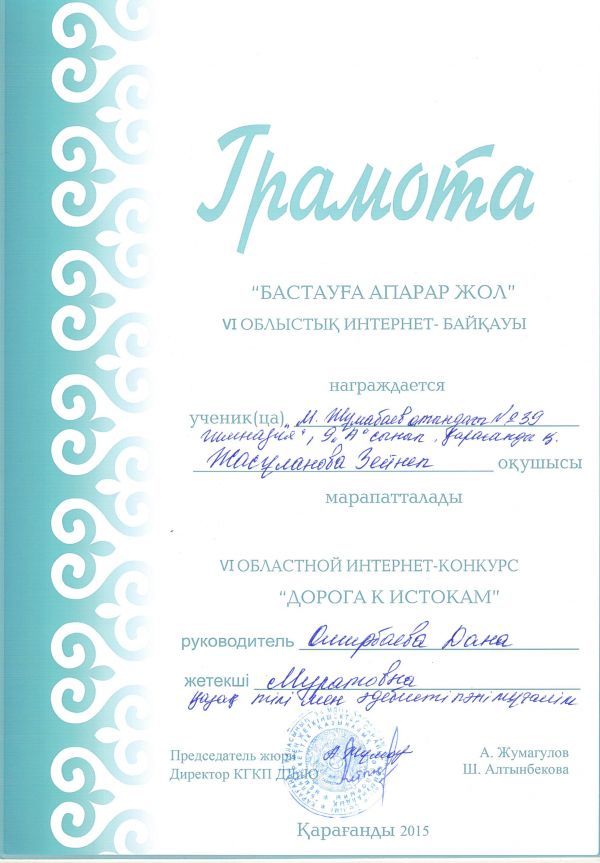 «Бастауға апарар жол» VI облыстық интернет-байқауына қатысып «Әдеби шығармашылық» номинациясының жеңімпазы атанғаны үшін 9 "А" сынып оқушысы Мұсылманбе…