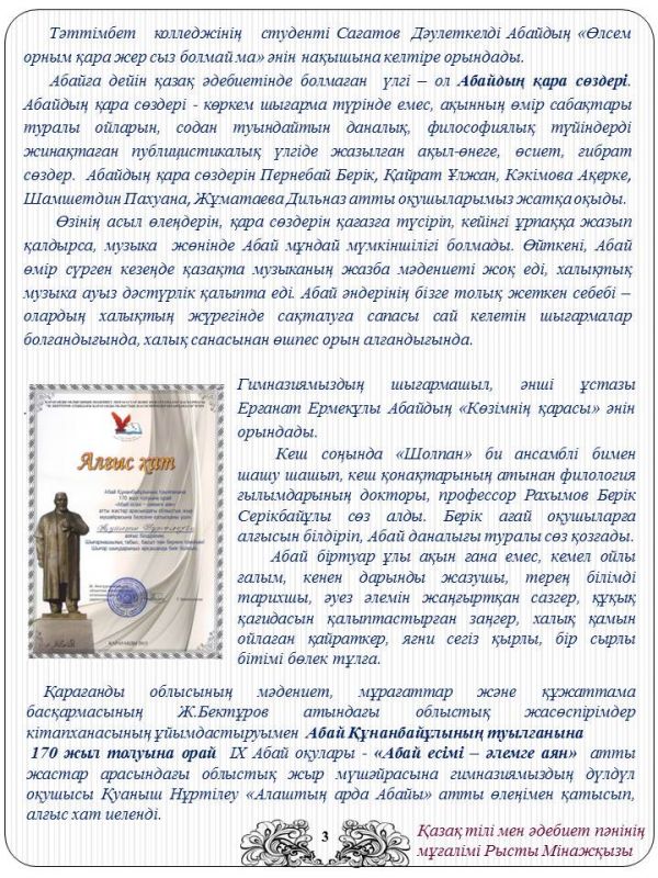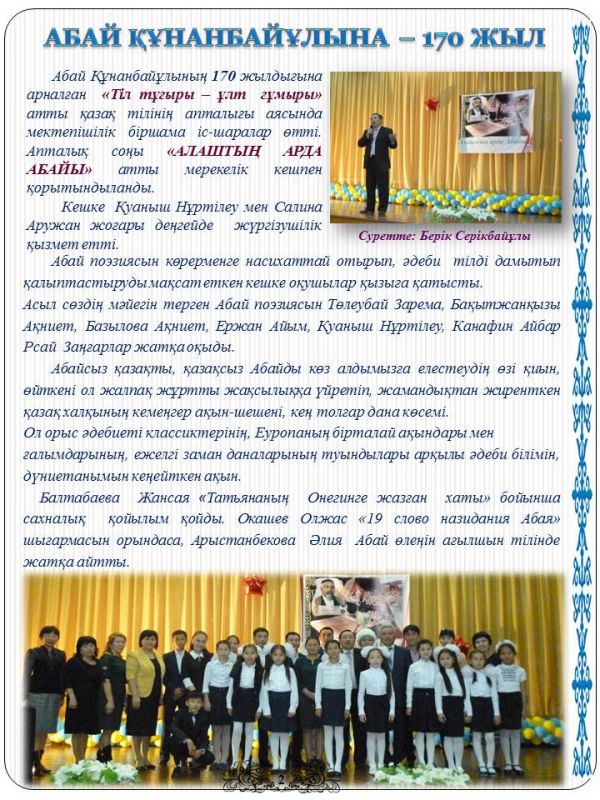 3.12.2015 күні Абайдың туғанына 170 жыл толуына орай қазақ тілі мен әдебиеті пәнінің мұғалімі Сұраған Орден 8 «Б» сыныбында «Абайдың он жет…