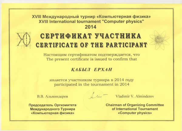 М.Жұмабаев атындағы №39 гимназияның 11 сынып оқушысы Қабыл Ерхан «Компьютерлік физика - 2014» Халықаралық турнирі аясында өткен компьютерлік шыға…