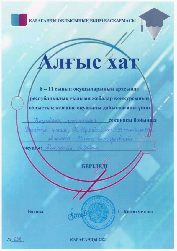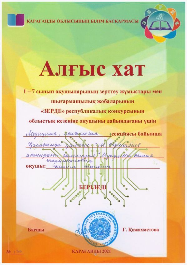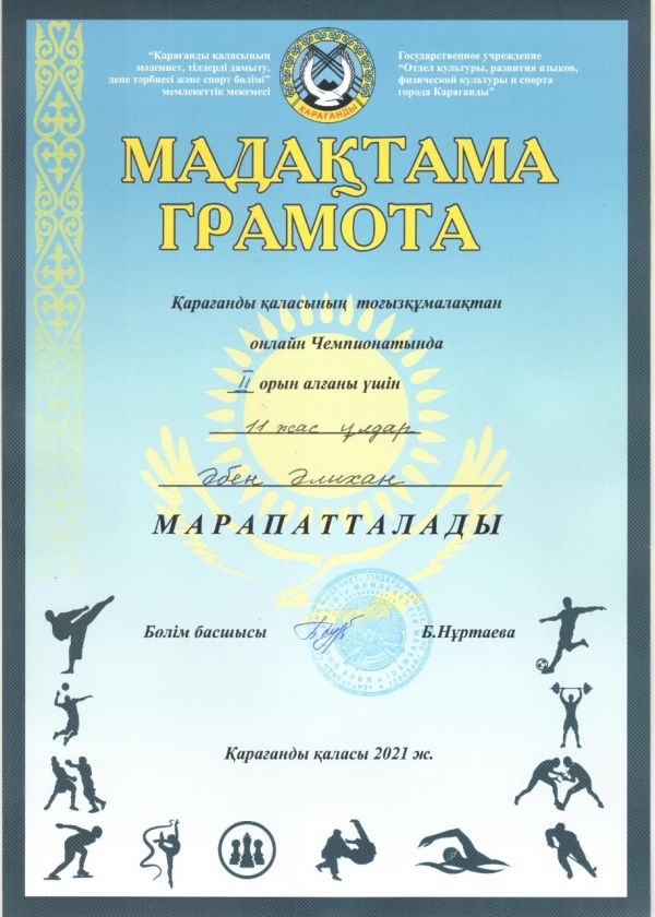 «ЖЫЛ КОМАНДАСЫ-2021» ЗИЯТКЕРЛІК МАРАФОНЫНА ҚАТЫСЫП ЖҮЛДЕЛІ 2 ОРЫН АЛҒАН ГИМНАЗИЯ ОҚУШЫЛАРЫН ЖЕҢІСТЕРІМЕН ҚҰТТЫҚТАЙМЫЗ! КОМАНДА ҚҰРАМЫ: 4СЫНЫП РАХИМБЕКОВ АМИР 5СЫНЫП ДУЛАТ СҰЛУ 6 СЫНЫП НУРГАЛИЕВА ФАТИ…