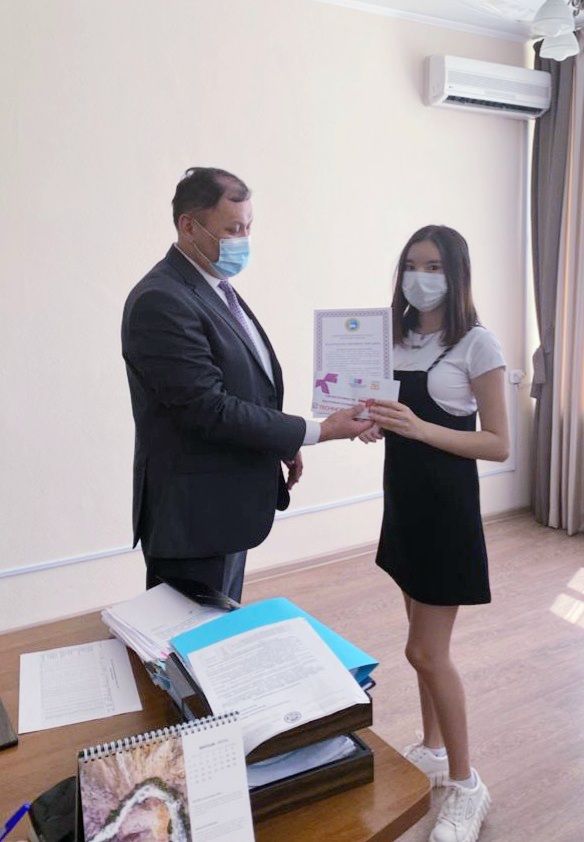 Қала мектептерінің 10 сынып оқушылары арасында «Біз Жеңістің ұрпақтарымыз» атты олимпиадаға қатысып жүлделі 2 орын алған гимназия оқушысы Тлешқызы Айгерім мен жетекшісі Садирбеков Айдын Турсыновичт…