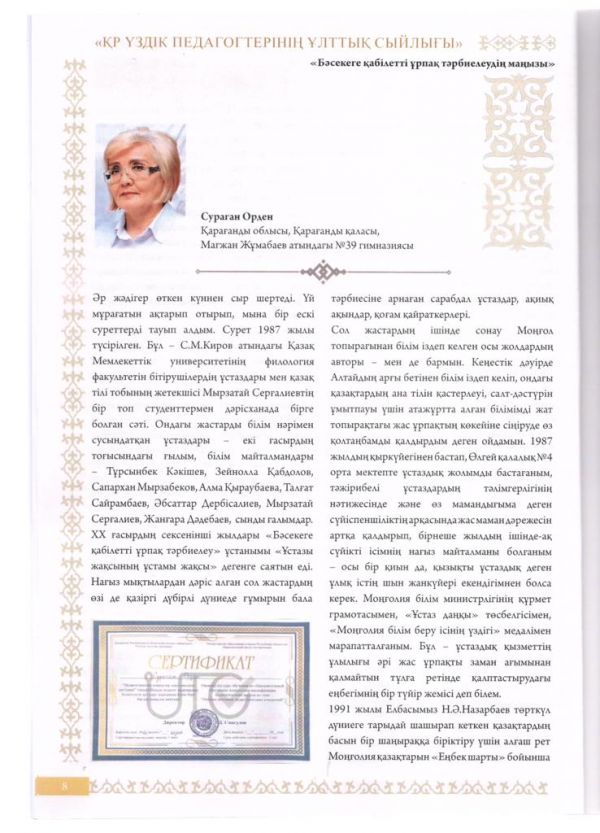 "ҚР ҮЗДІК ПЕДАГОГТЕРІНІҢ ҰЛТТЫҚ СЫЙЛЫҒЫ" атты республикалық байқауға қатысып жеңімпаз атанған Орден Сұрағанқызы I дәрежелі дипломмен марапатталды. Ұстаздық еңбегіңіздің жемісін көре беріңіз! Шығармашы…