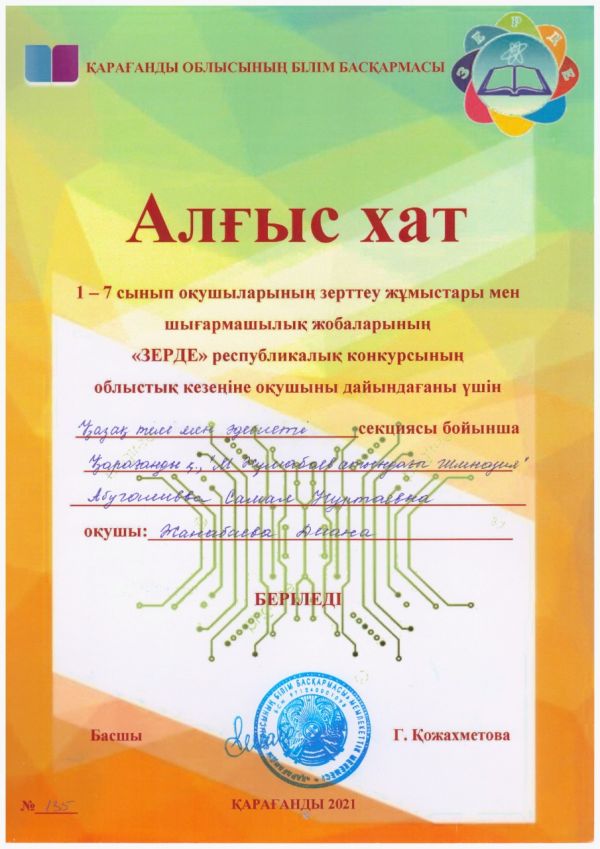 1-7 сынып оқушыларының зерттеу жұмыстары мен шығармашылық жобаларының «Зерде» республикалық конкурсының облыстық кезеңіне қатысып, жүлделі орындарды иеленген Көшімбай Жасминді, Жанабаева Диананы құтты…