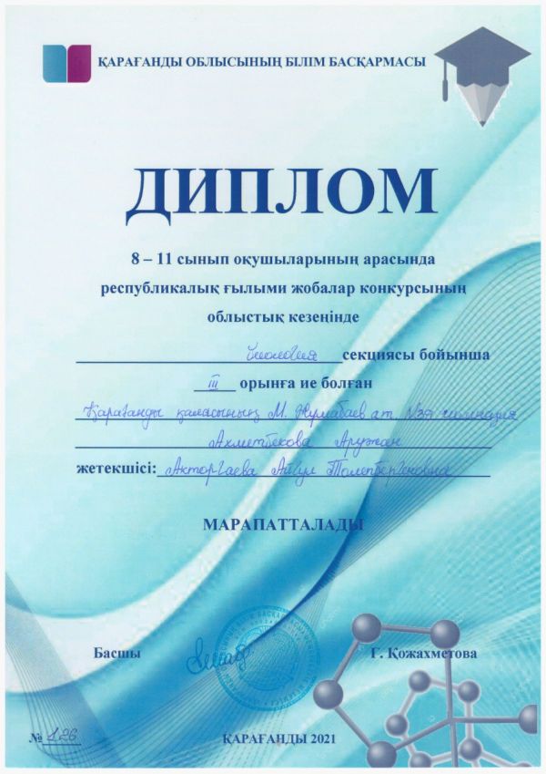 8-11 сынып оқушыларының арасында республикалық ғылыми жобалар конкурсының облыстық кезеңінде «Қолданбалы математика» бағыты бойынша ІІІ орын иеленген Мақсұтова Бегайымды және «Биология» бағыты бойынша…