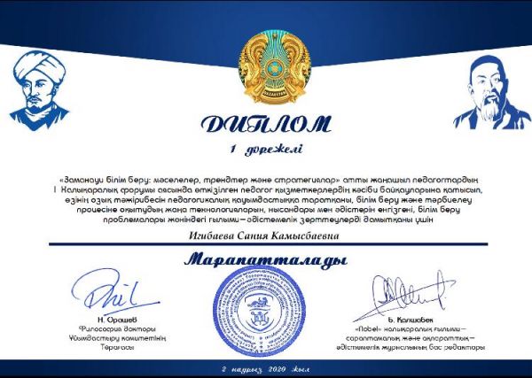 «Заманауи білім беру:мәселелер, трендтер және стратегиялар» атты жаңашыл педагогтардың І халықаралық форумы аясында өткізілген педагогтардың кәсіби байқауларына қатысқандары үшін Игибаев…