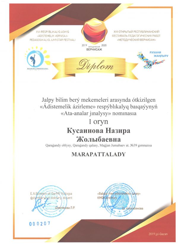 Жалпы білім беру мекемелері арасында өткізілген «Әдістемелік әзірлеме» республикалық байқауының «Ата-аналар жиналысы» номинациясы бойынша І орынға ие болғандары үшін Каржасбе…
