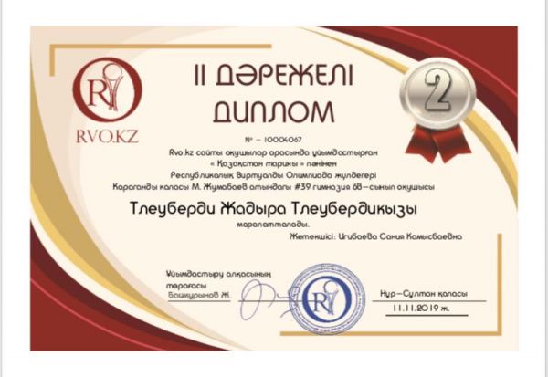 RVO.KZ сайты оқушылар арасында ұйымдастырған «Қазақстан тарихы» пәнінен Республикалық Виртуалды Олимпиада жүлдегерлері Болатов Алемби, Бауыржанқызы Нұрай, Жақсылық Рабиға, Мухаметж…
