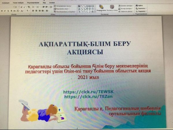 Қарағанды облысы бойынша білім беру мекелерінің педагогтері үшін Өзін-өзі тану бойынша облыстық акцияға қатысып « Өзін-өзі тану сабағында мұғалім сыйының рөлі» атты жұмыстарын Мукажанова…