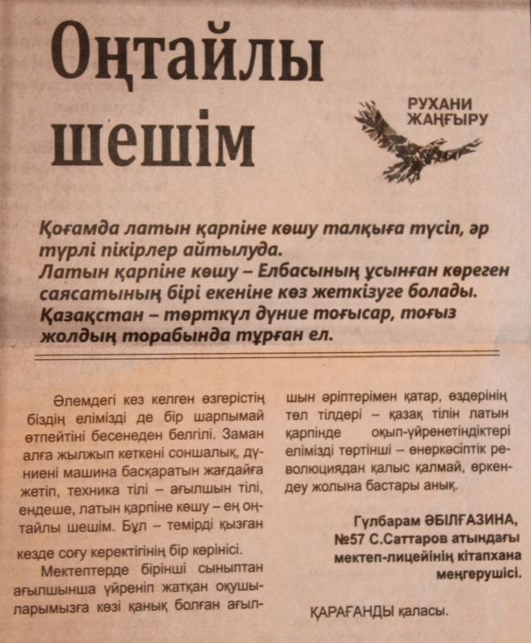 Мектебіміздің кітапханашысы Әбілғазина Гулбарам Латын қарпіне көшуге байланысты өзінің пікірін білдіріп, Облыстық Орталық Қазақстан…