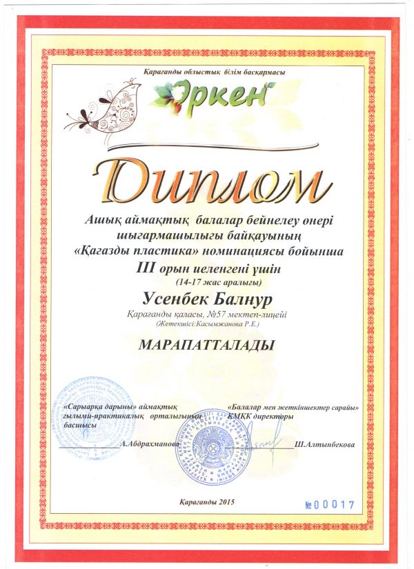 Ашық аймақтық балалар бейнелеу өнері шығармашылығы байқауында «Батик» номинациясына қызықты жұмыстар ұсынғаны үшін Ыбырай Аида дипломмен марапатталды. Жетекшісі: Мұқыжанова Назгуль Матан…