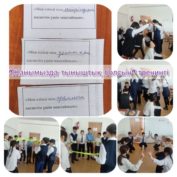 "1 наурыз-Алғыс айту" мерекесінің жоспарына сәйкес психолог С.Б.Ильяшова 7«Б» сынып оқушыларымен "Жанымызда тыныштық болсын" тақырыбында тренинг өткізді. Мақсат…