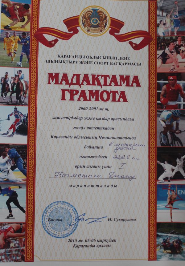 2000-2001 ж.т. жасөспірімдер және қыздар арасындағы жеңіл атлетикадан Қарағанды облысының чемпионатында "Диск" лақтырудан I орынға ие  болғаны үшін Нығыметолла Диана мадақтамамен мара…