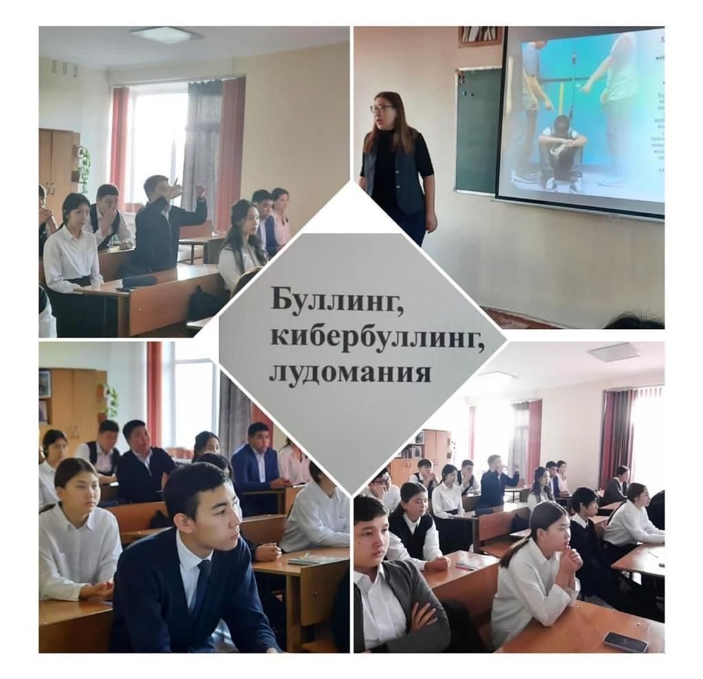 Педагог-психолог С.Б. Ильяшова 10б сыныбының оқушыларымен "Буллинг, кибербуллинг және лудомания" тақырыбында психологиялық сағат өткізді. Мақсаты: мектепте қауіпсіз ортаны қалыптастыру, зо…