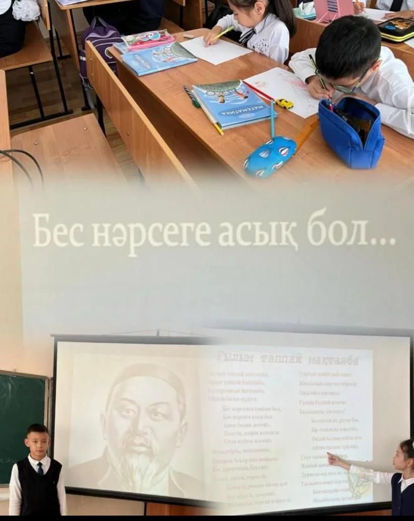2"А" сыныбында "Бес нәрсеге асық бол" тақырыбында сынып сағаты өткізілді. Мақсаты: оқушыларға ұлы Абай атамыздың "Ғылым таппай мақтанба" өлеңіндегі бес асыл қасиет ( та…