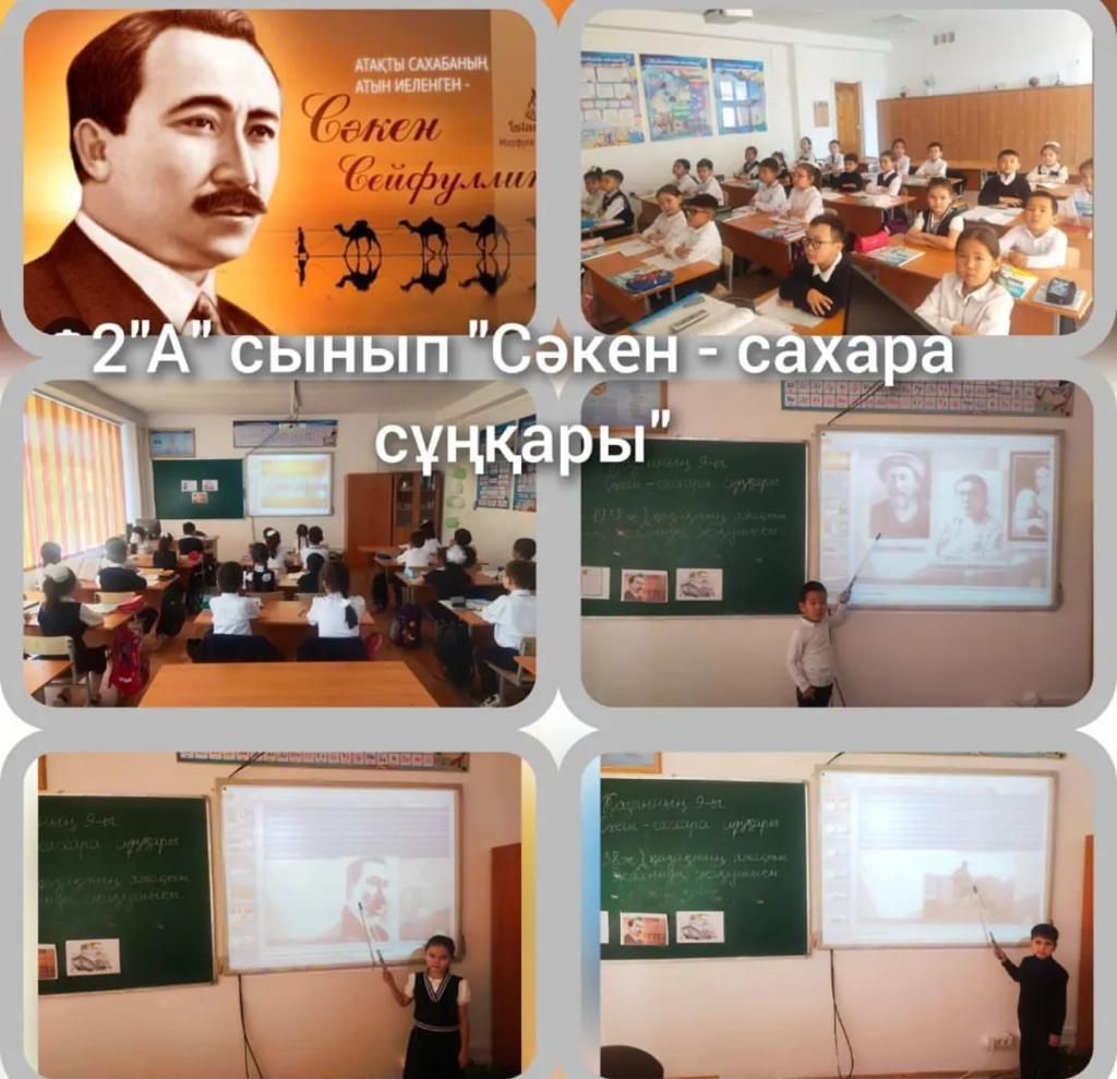 2"А" сыныбында Сәкен Сейфуллин туғанына 130 жыл толуына орай "Сәкен - сахара сұңқары" тақырыбында сынып сағаты өткізілді.