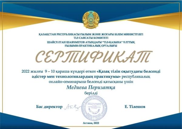 "Тіл - қазына" ұлттық ғылыми- практикалық орталығының ұйымдастыруымен өткен республикалық онлайн семинарға белсене қатысқаны үшін қазақ тілі мен әдебиеті пәнінің мұғалімі Ме…