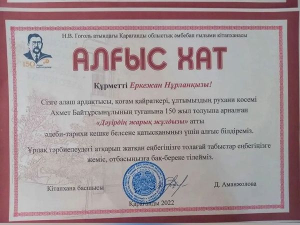 Көркем еңбек пәні мұғалімі Касымжанова Рита Еркиновна Қарағанды облысының әкімі Алғыс хатымен марапатталды.