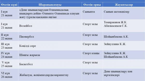 21-26 ақпан аралығында "Сау болсаңыз, бәріне жетесіз" атты дене шынықтыру апталығының жоспары.