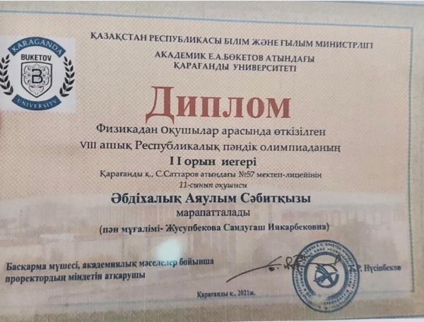 VII Ашық Республикалық балалар бейнелеу және сәндiк-қолданбалы өнер байкауының «Менiң таңғажайып әлемiм», «сәндiк-қолданбалы өнер» номинациясында Ауесбаева Амина II дәрежелi…