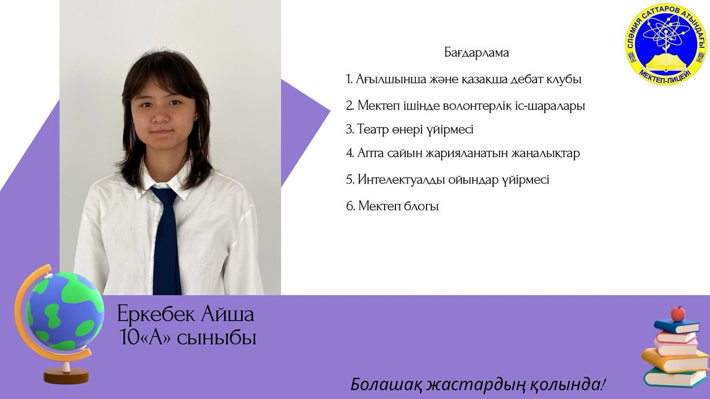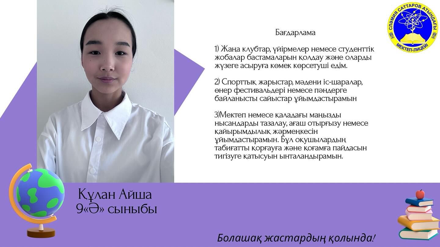 1 үміткер - Тусупханова Меруерт 10 «А» сыныбы; 2 үміткер - Еркебек Айша 10 «А» сыныбы; 3 үміткер - Абдыр…