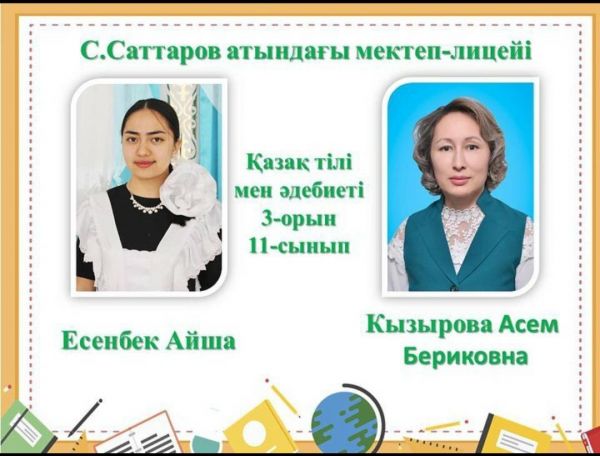 Ашық Республиқалык балалар бейнелеу өнерi шығармашылығы байқауына қатысушыларды үздiк дайындағаны үшiн көркем еңбек пәнi мұғалiмi Қасымжанова Рита Еркиновна Алғыс хатпен марапатталды.