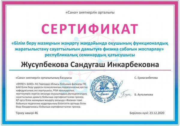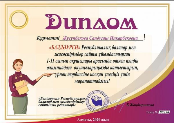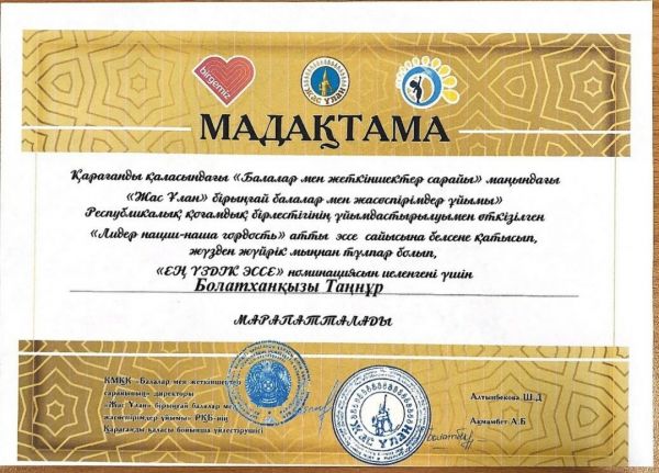Қарағанды қаласының "Жас Ұлан" бірыңғай балалар мен жасөспірімдер ұйымы" ұйымдастыруымен өткізілген «Лидер нации - наша гордость» атты эссе сайысынан «Ең үздік эссе…
