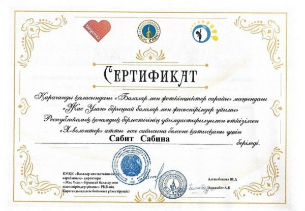 Қарағанды қаласының "Жас Ұлан" бірыңғай балалар мен жасөспірімдер ұйымы" ұйымдастыруымен өткізілген "Я - волонтёр» атты эссе сайысына қатысып, "Ең үздік эссе"…