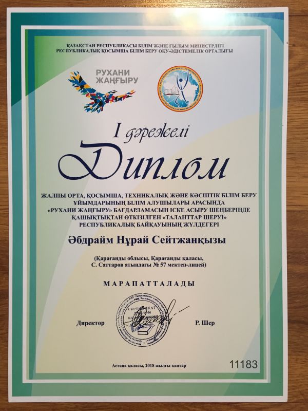 І Халықаралық «Жас талант» сайысына қатысып, ән номинациясы бойынша жеке орындауда өнерін көрсетіп, жүлделі І орын иеленгені үшін 6 сынып оқушысы Несіпбай Санжа…