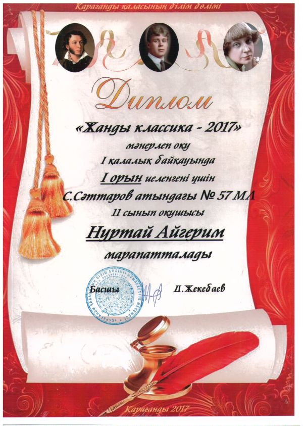 «Жанды классика – 2017» мәнерлеп оқу І қалалық байқауында І орын иеленгені үшін 11 сынып оқушысы Нуртай Айгерим, пән мұғалімі: Рахимбекова А.Р., ІІ орын…