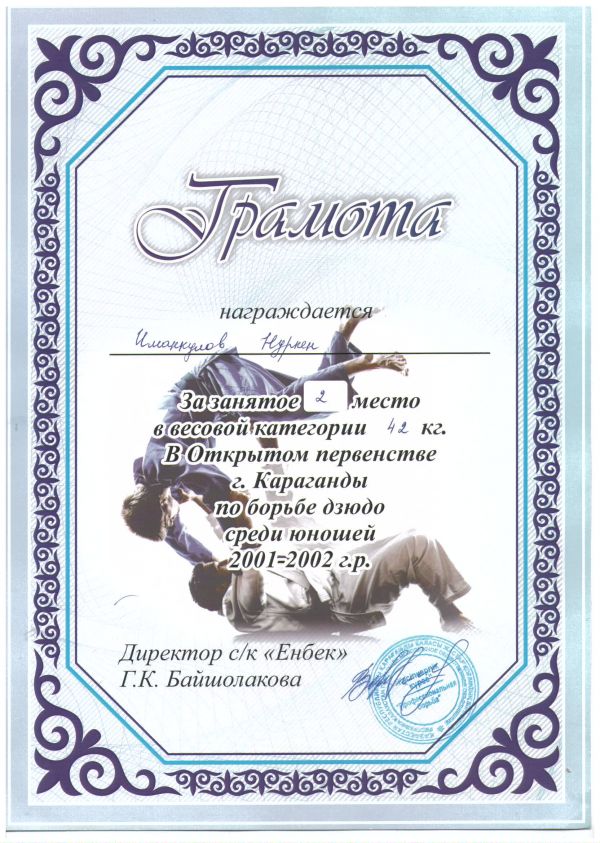 Қарағанды қаласының дзюдодан 2001-2002 ж жастар арасындаашық біріншілігінде IIорыналған үшін Иманкулов Нуркен марапатталады.