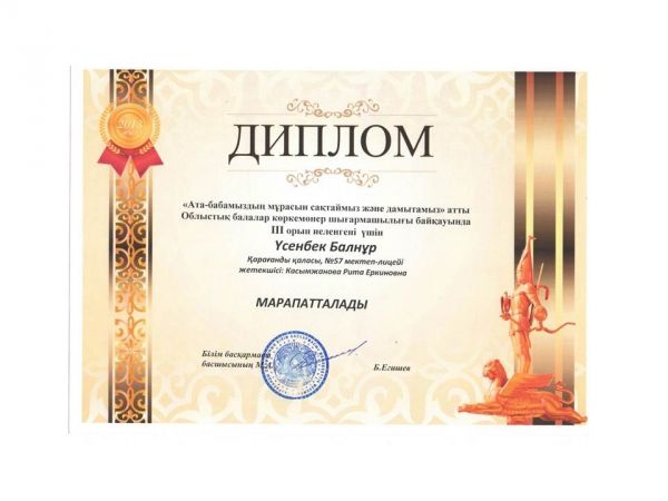 "Өркен" ашық Республикалық балалар бейнелеу және сәндік-қолданбалы өнер байқауына мектеп оқушылары қатысып Үсенбек Балнұр "Ши тоқыма" номинациясында I-ші орынға, Абильхасенова Ал…