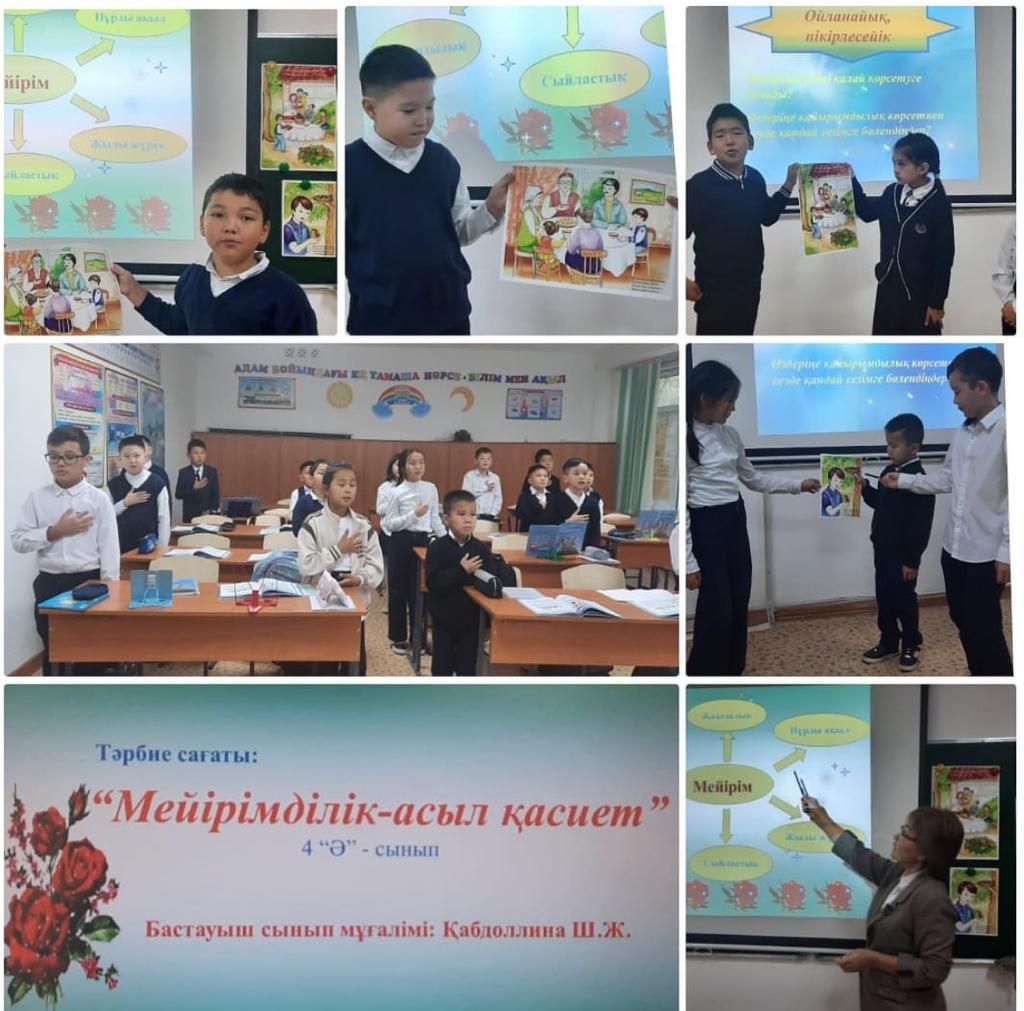 25.09.2023 жылы 4 "Ә" сыныбында "Мейірімділік - асыл қасиет" тақырыбында сынып сағаты өткізілді. Мақсаты: Оқушылардың мейірімділік, қайырымдылық туралы түсініктерін кеңейту. Бала…