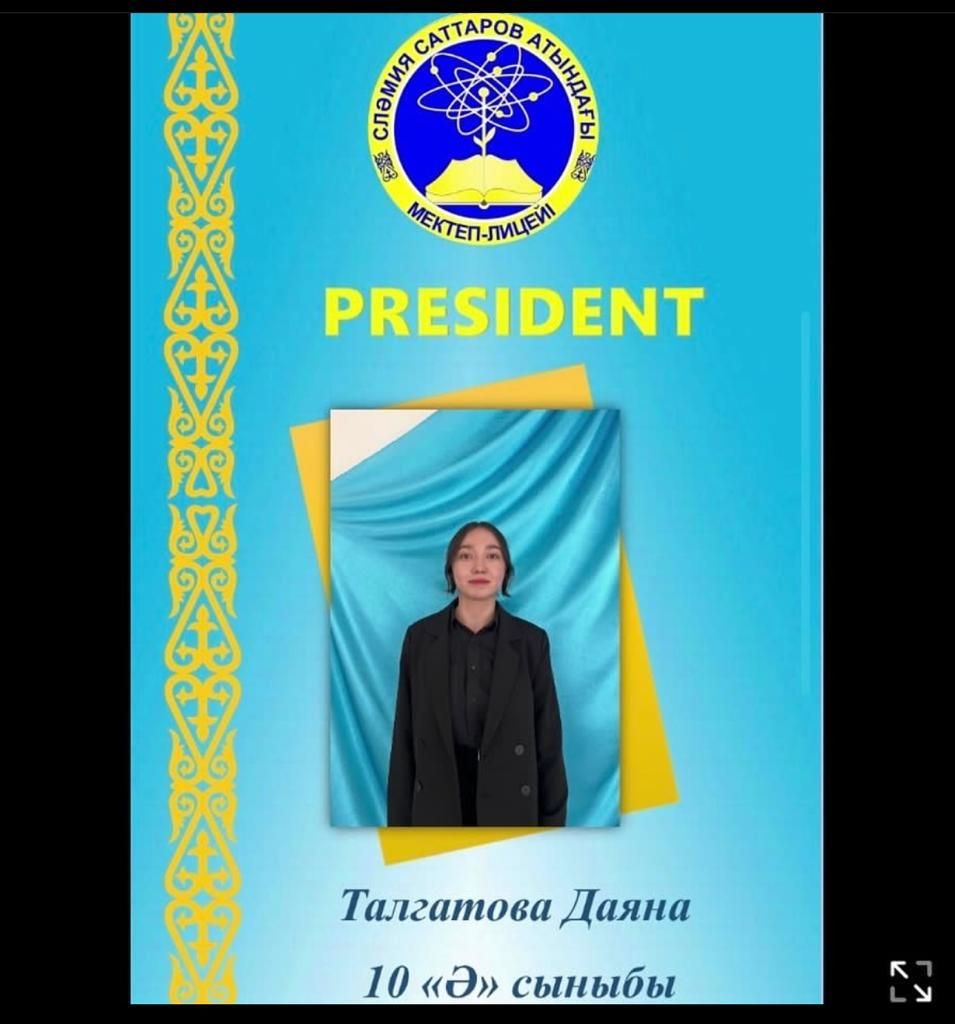 С.Саттаров атындағы мектеп-лицейінде «Өзін-өзі басқару ұйымының» Президент сайлауы өтті. Сайлау нәтижесі бойынша 102 дауыспен 10 «Ә» сыныбының оқушысы Талгатова Даяна Президе…