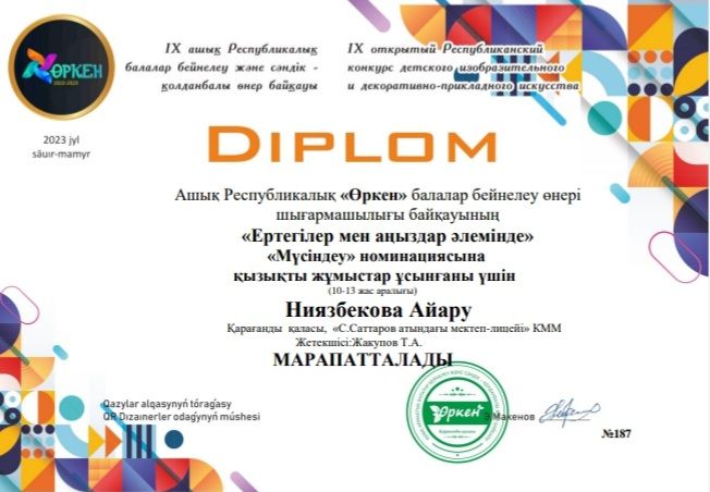Құттықтаймыз! «ӨРКЕН» IХ Ашық Республикалық балалар бейнелеу және сәндік – қолданбалы өнер көрме-байқауының, «Ертегілер мен аңыздар әлемінде» номинациясында: …