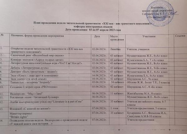 03.04.2023 года в школе-лицее им.С.Саттарова была проведена линейка, посвященная открытию недели читательской грамотности “ХХІ век-век грамотного поколения”.