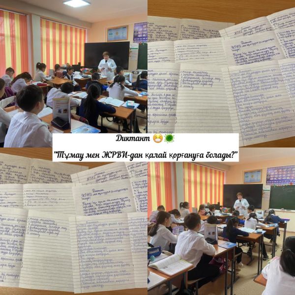 Мектеп-лицейдің медбикесі Искакова Саида Жумановна 4-сынып оқушыларынан "Тұмау мен ЖРВИ-дан қалай қорғануға болады?" тақырыбында диктант алды.