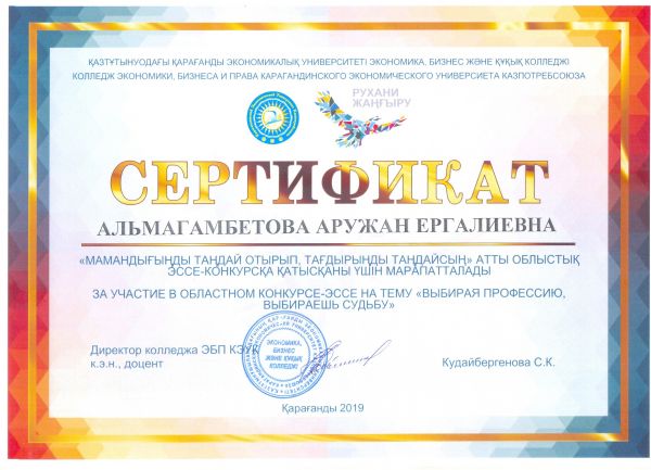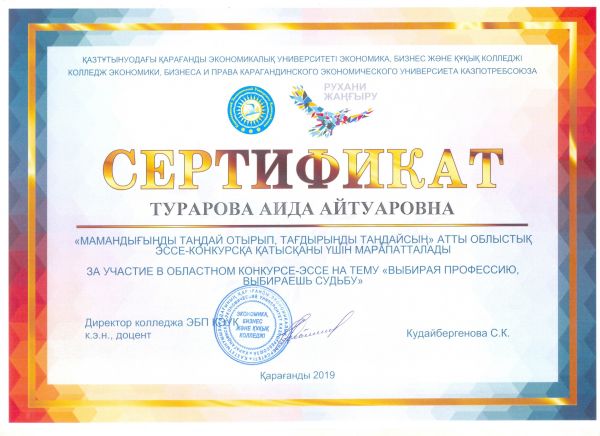 "Мамандығыңды таңдай отырып, тағдырыңды таңдайсың" атты облыстық эссе-байқауынан ІІ дәрежелі дипломмен марапатталған 9 "Б"…