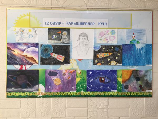 12 сәуір күні ғарыш күніне орай «Ғажайып ғарыш әлемі» тақырыбына сурет көрмесі  өтті.       Көрменің мақсаты: Оқушыларға бейнелеу өнерінің қыр-…