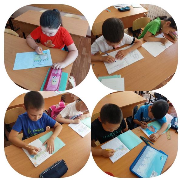 2"А",2"Ә",2"Б" сынып оқушыларымен жазғы мектепте әдебиеттік оқу сабағында "Жайлау" тақырыбында сюжеттік суреттер салды