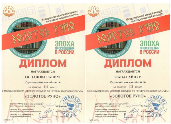 "KazRoboSport-2017" аймақтық іріктеу чемпионатында "Сызықпен жүру" категориясы бойынша ІІІ  дәрежелі  дипломмен   Закиров Жеңіс, Садыков…
