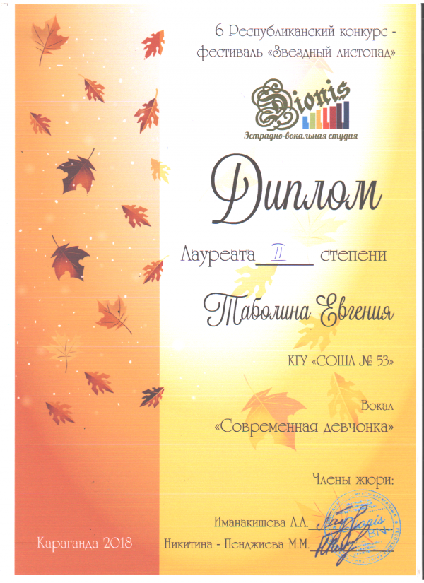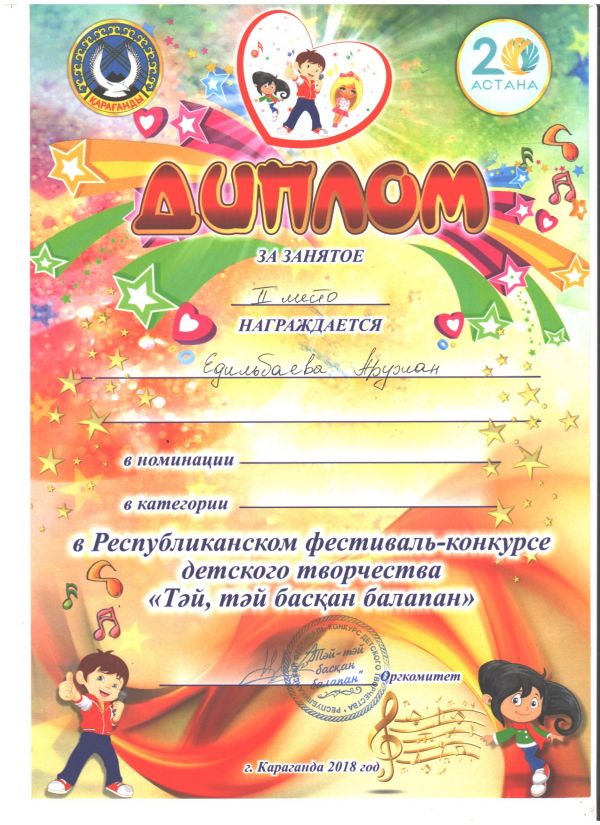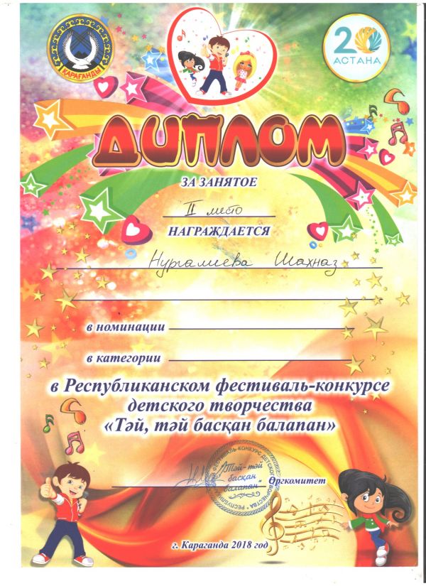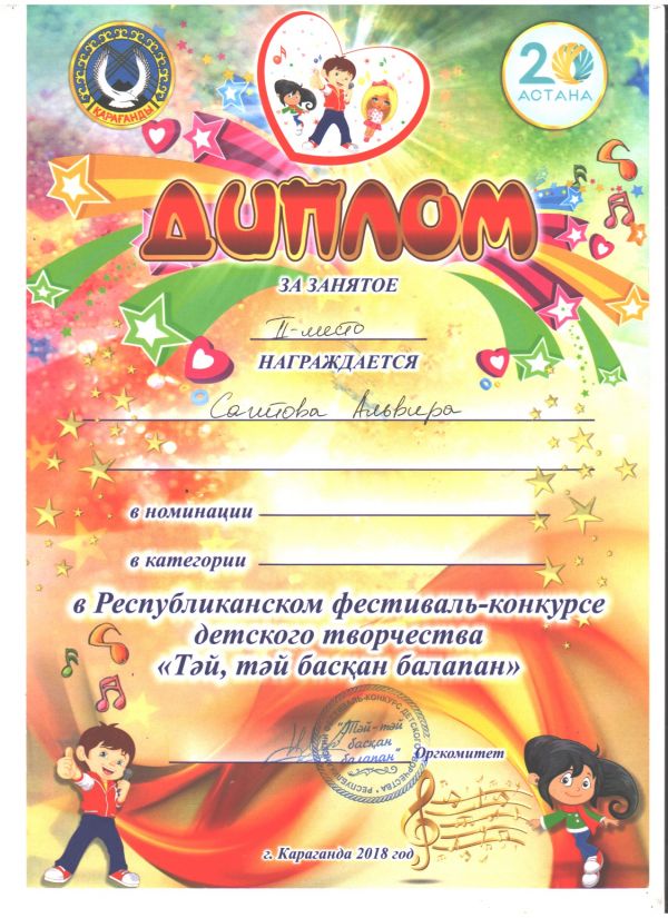 18.11.2018 жылы Республикалық «Open International competition of art and dance sport Grand Pix-2018» байқауына қатысып, Қанатқызы Алуа бас жүлде дипломымен марапатталды.