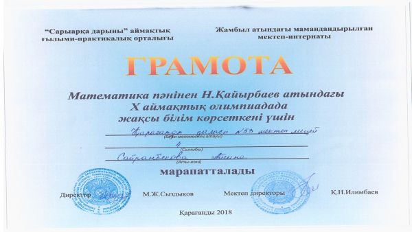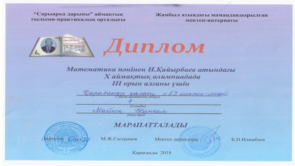 Математика пәнінен Н.Қайырбаев атындағы Х аймақтық олимпиадада КММ ЖОББ №53 мектеп –лицейінің 4А сынып оқушысы Майкен Жансая III орын алғаны үшін дипломмен және жақсы білім көрсетк…