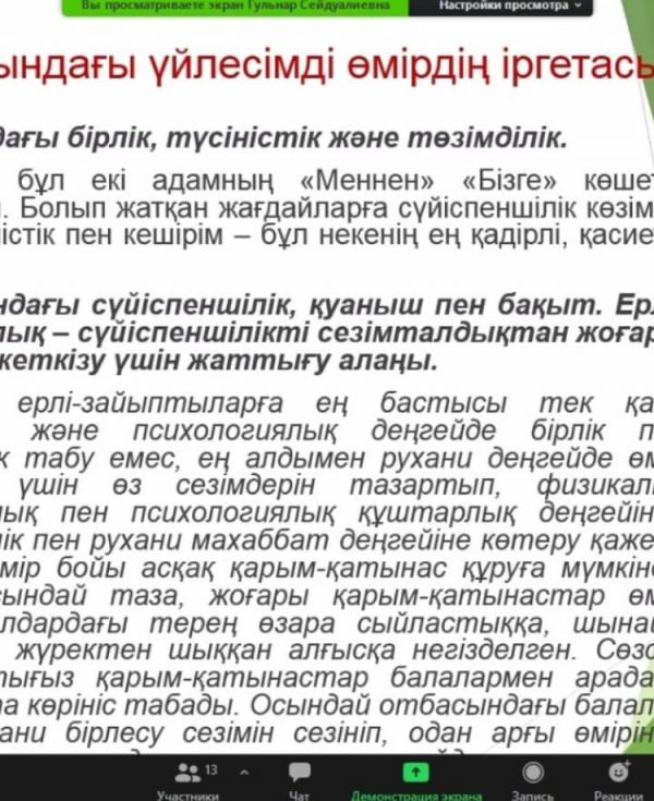 21.11.2020 күні ZOOM платформасында "Жалпыадамзаттық құндылықтар" апталығы аясында, мектеп мұғалімдерімен "Жалпыадамзаттық құндылықтар-тұлғаны рухани-адамгершілік тәрбиелеуді…
