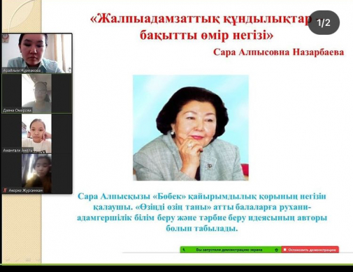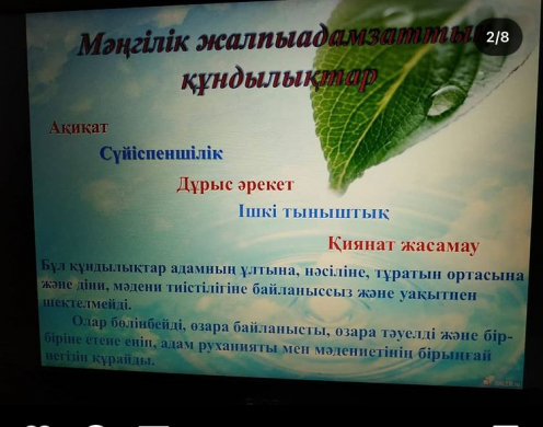 Жалпыадамзаттық құндылықтар күніне орай өткізілген 8"а" сыныбында өткізілген онлайн сынып сағаты. Сынып жетекшісі Калыкова А.Б.