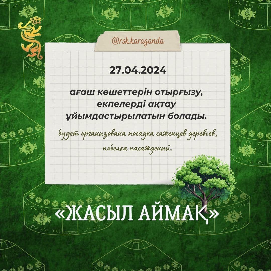 ағаш көшеттерін отырғызу, екпелерді ақтау ұйымдастырылатын болады. вудет организована посадка саженцев деревьев, побелка насаждений. «ЖАСЫЛ АЙМАҚ»