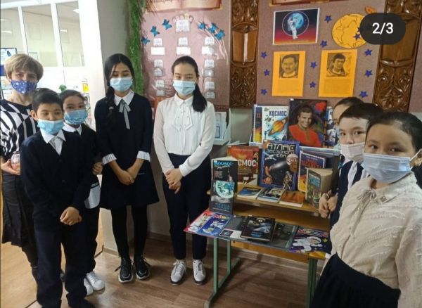 Мектеп кітапханасында мектеп оқушылары Космонавтика күніне арналған кітап көрмесімен танысты. Біз «Тәтті викторинаның» ғарышты зерттеуге арналған сұрақтарына жауап бердік.
