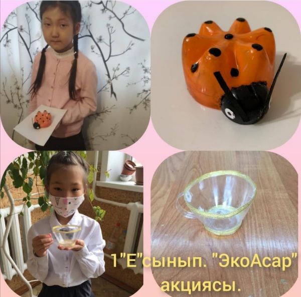 1«Е» сынып оқушылары Дүйсенбекова Зере мен Азаматқызы Айша «ЭкоАсар» акциясы аясында қалдықтардан керекті заттар жасады. Сынып жетекшісі: Елубаева Эльмира