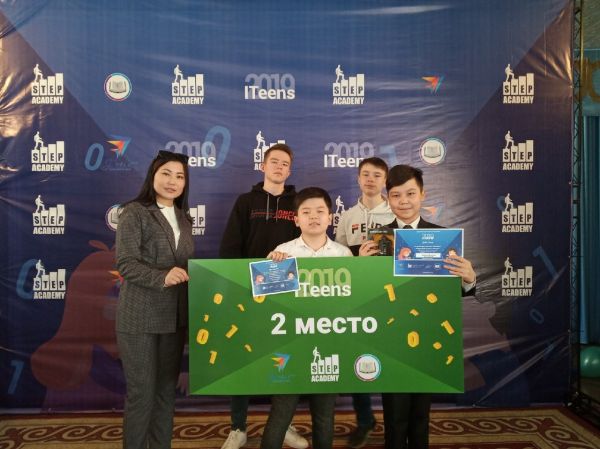 В городском конкурсе хакатонов" ITeens-2019 "по направлению" Графика "ученик 7А класса Жамелов Асылхан руководитель Жагай Ажар и ученик 10Б класса Пицуренко Владислав руководител…