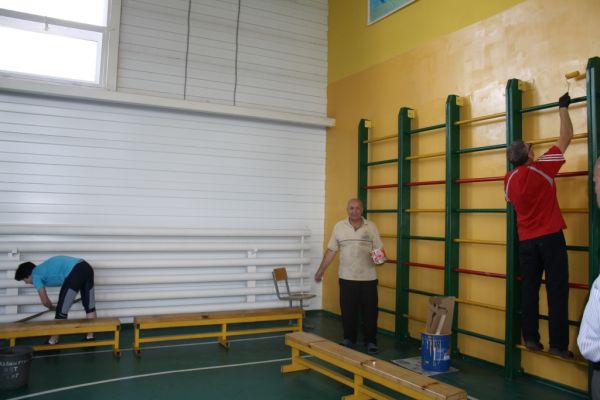 Подготовка спортивного зала к новому учебному году учителями физической культуры.